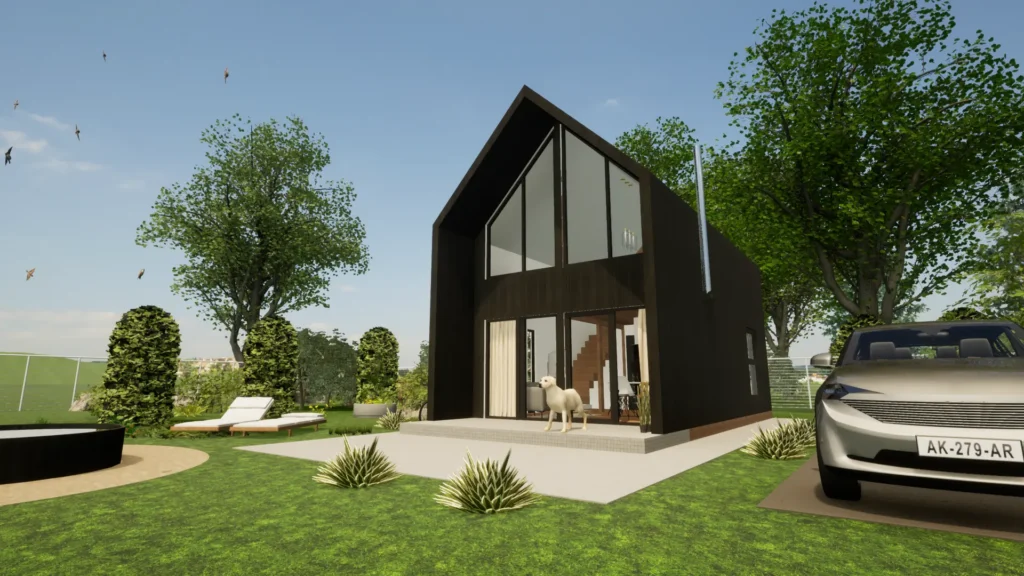 Urzekający nowoczesnym designem dom szkieletowy w formie "nowoczesnej stodoły" o powierzchni zabudowy 35m2. Możliwość doboru koloru elewacji, jednak najpiękniej naszym zdaniem prezentuje się w kolorze czarnym. Duże przeszklenia frontowe doskonale doświetlają wnętrze potęgując wrażenie ultra nowoczesnej bryły. Pamiętaj budujemy domy szkieletowe bazując na wzorcach pochodzących z zagranicy. Są dopracowane i energooszczędne.